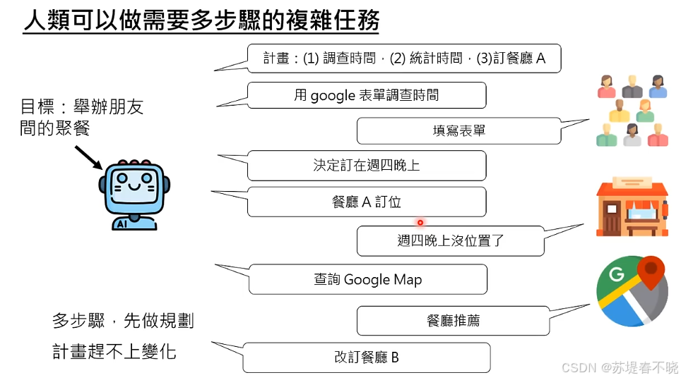 根据接收到的终极目标,感知到的外界状态,积累记忆经验,拟定计划,根据计划产生行动,收到新的外界状态变化后,重新拟定计划(更新记忆),action ...