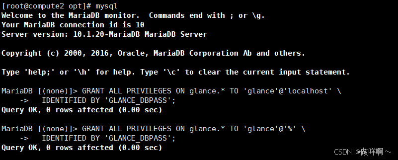 GRANT ALL PRIVILEGES ON glance.* TO 'glance'@'localhost' \