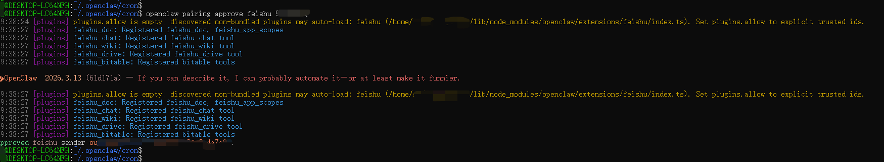 把上图红色框框里面的命令敲到wsl本地的openclaw交互界面,显示如下: