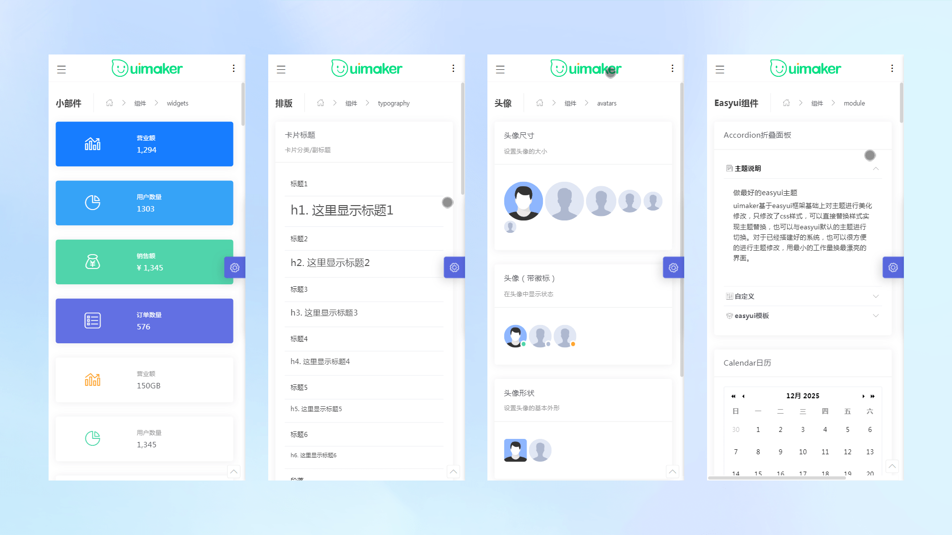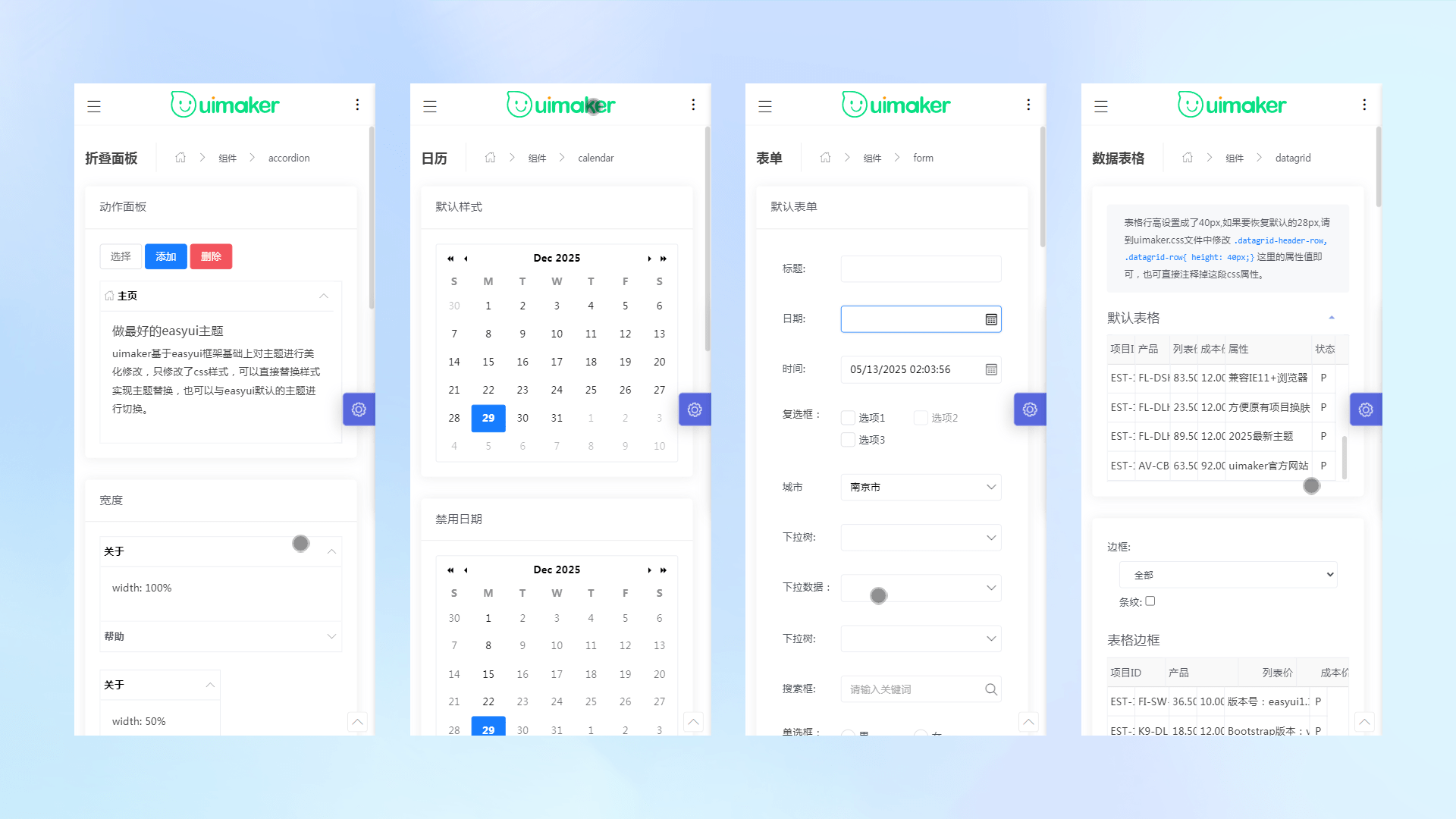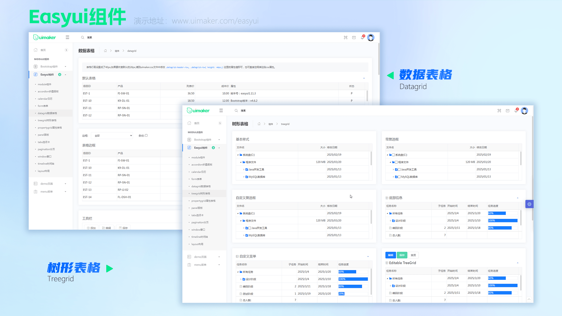 包括Accordion折叠面板、Calendar日历、Linkbutton按钮、Tabs选项卡、Tree树、Menu菜单、Datalist数据列表、Treegrid树形表格、Slider滑动条、SwitchButton开关按钮、Sidemenu侧栏菜单、Propertygrid属性表格、Progressbar进度条、Pagination分页、Swiper幻灯片、Rate评分、Loading加载、Form表单、Datagrid数据表格、Panel面板、Window窗口、Timeline时间轴、Layout布局等全部easyui原生组件。