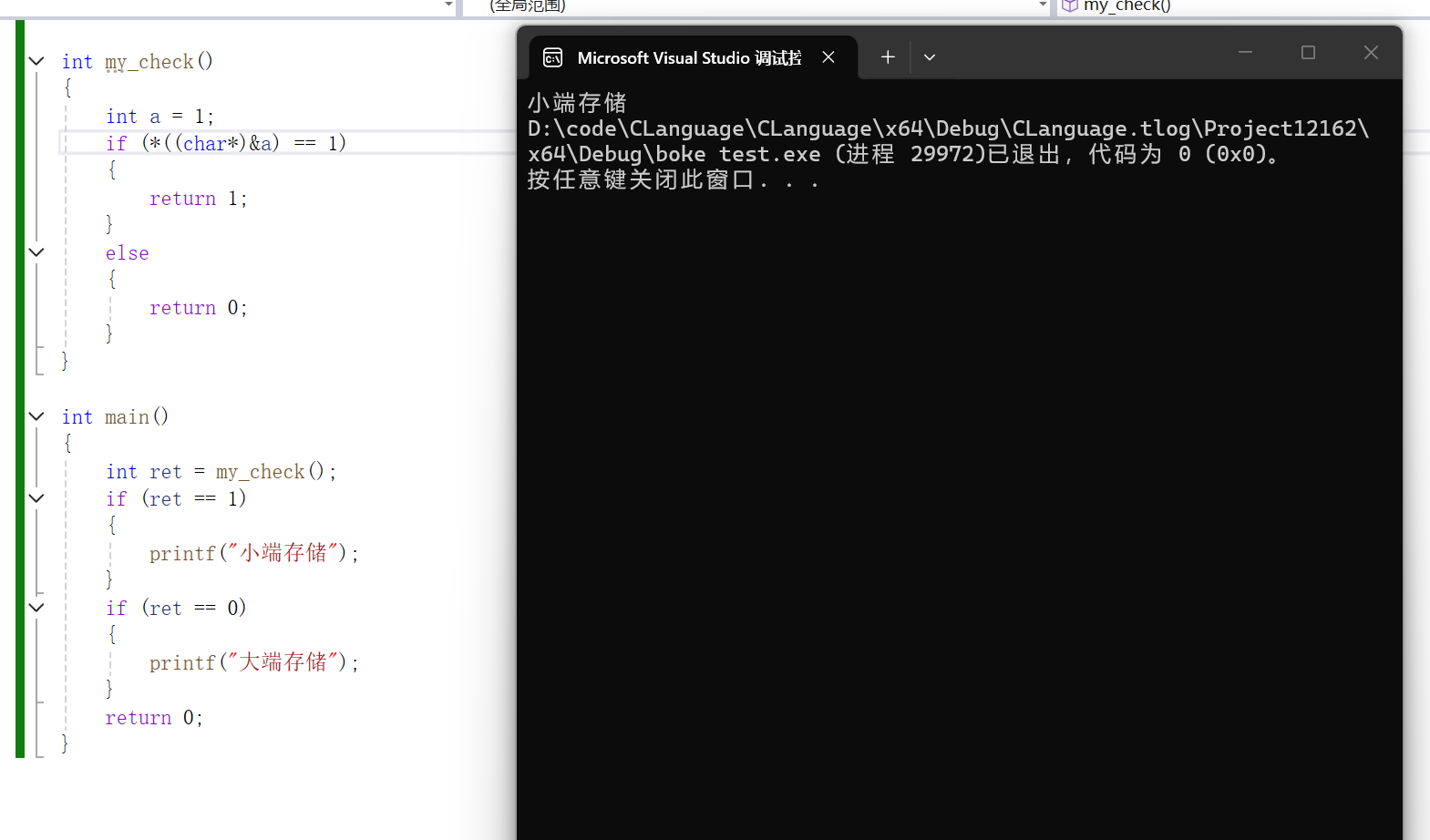 讲完了大小端的概念,接下来,我来给大家写一个代码,来来判断一下,我现在使用的编译器对于内存的存储是大端存储还是小端存储,大家请看下面的代码。