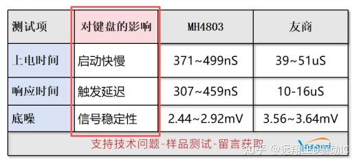 作为将磁场变化转换为电压信号的器件,线性霍尔的上电时间、响应速度、输出底噪三项指标,直接影响键盘的启动延迟、触发实时性与信号稳定性。本文以MH4803为例,在相同测试条件下将其与同类产品进行参数对比,聚焦磁轴键盘应用中的关键指标,为技术选型提供客观参考。