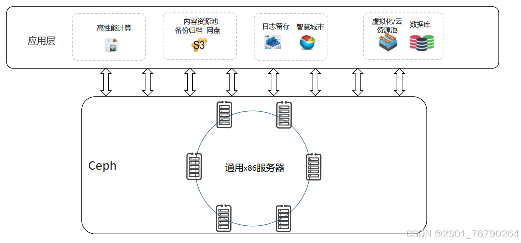 Ceph 存储可部署在通用服务器上, 这些服务器的CPU可以是x86架构, 也可以是ARM架构。 Ceph 支持在同一集群内既有x86主机,又有ARM 主机。