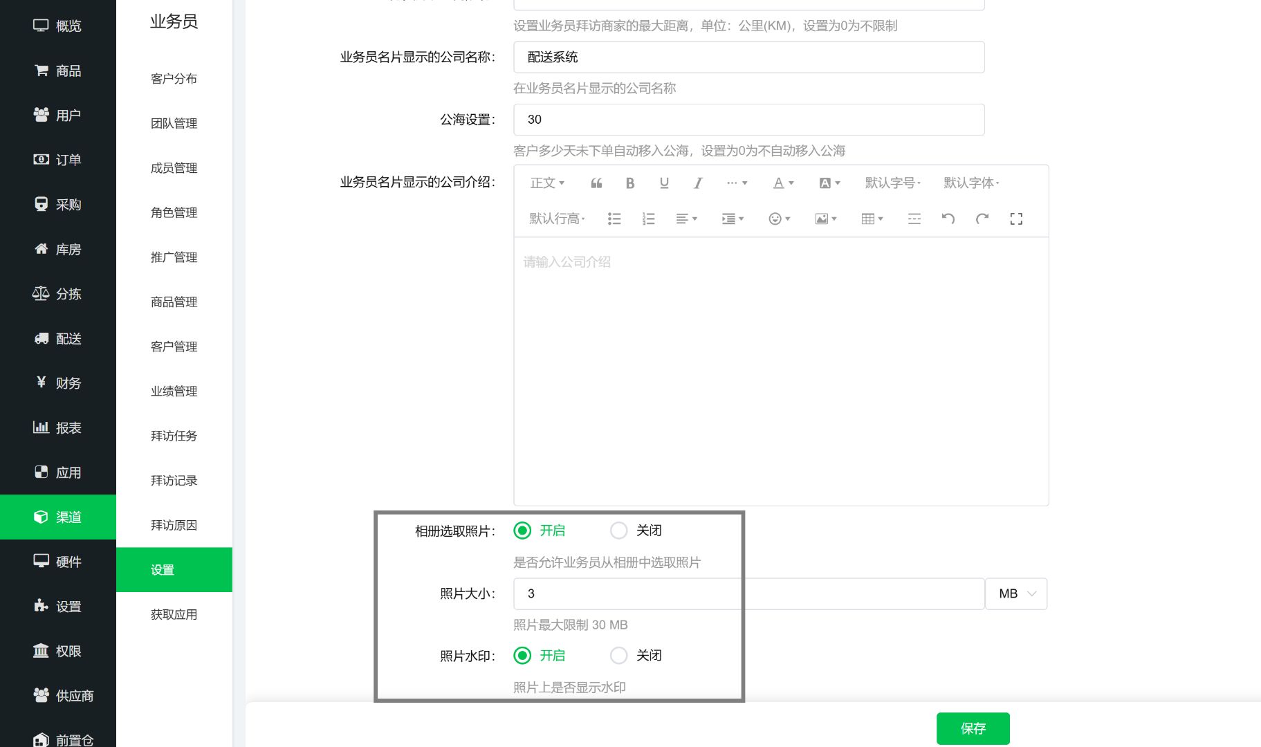 后台业务员设置里面拍照相片大小,是否加水印,以及水印字号相关设置:后台业务员管理模块新增拍照参数配置功能,可统一设置业务员拜访拍照的相片尺寸(如高清、标清),开启/关闭拍照水印功能,同时可调整水印字号大小,适配不同场景下的拍照需求,兼顾照片清晰度与水印辨识度,统一拜访照片管理标准。