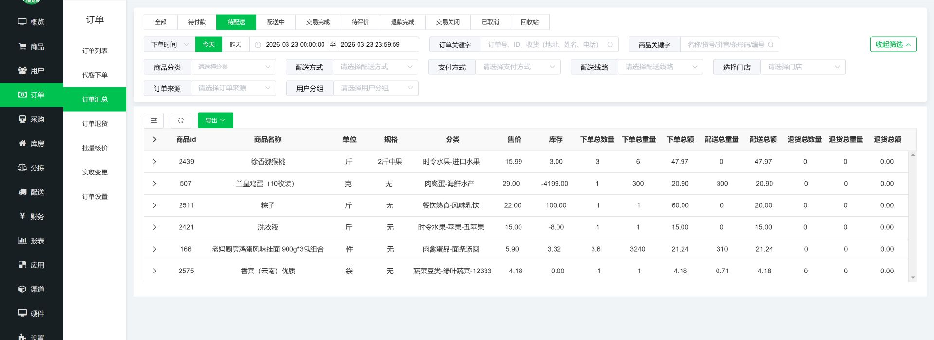 订单汇总增加订单状态筛选和列表显示,导出增加订单状态:优化订单汇总模块,新增订单状态筛选功能(如待付款、待发货、已配送、已完成、已取消、退货中),可根据单一或多个状态筛选订单,筛选结果以列表形式清晰展示,包含订单核心信息;同时,订单汇总导出功能新增订单状态字段,导出的Excel表格中会明确标注每个订单的状态,便于财务对账、业务统计。