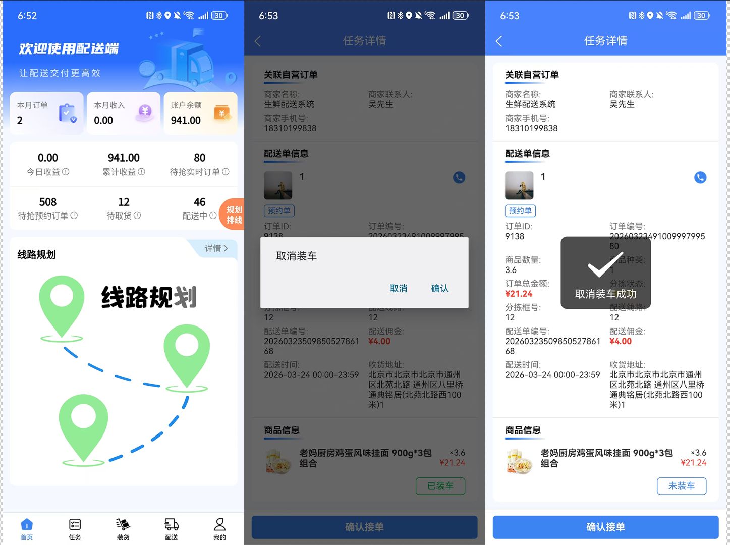 配送端取消装货功能(长按已装车取消):在配送端新增取消装货功能,配送员在装货过程中,若遇到商品异常、订单取消等情况,可长按"已装车"按钮,发起取消装货操作,取消后系统同步更新订单状态,通知相关人员,避免无效装货,提升配送效率。