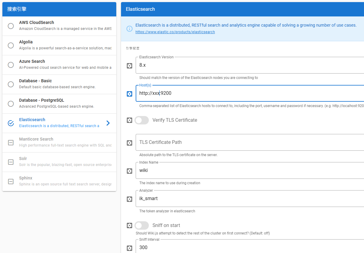 在wiki.js的搜索引擎设置页面,按下图设置。正常host处可以增加用户名和密码,但我测试失败了。