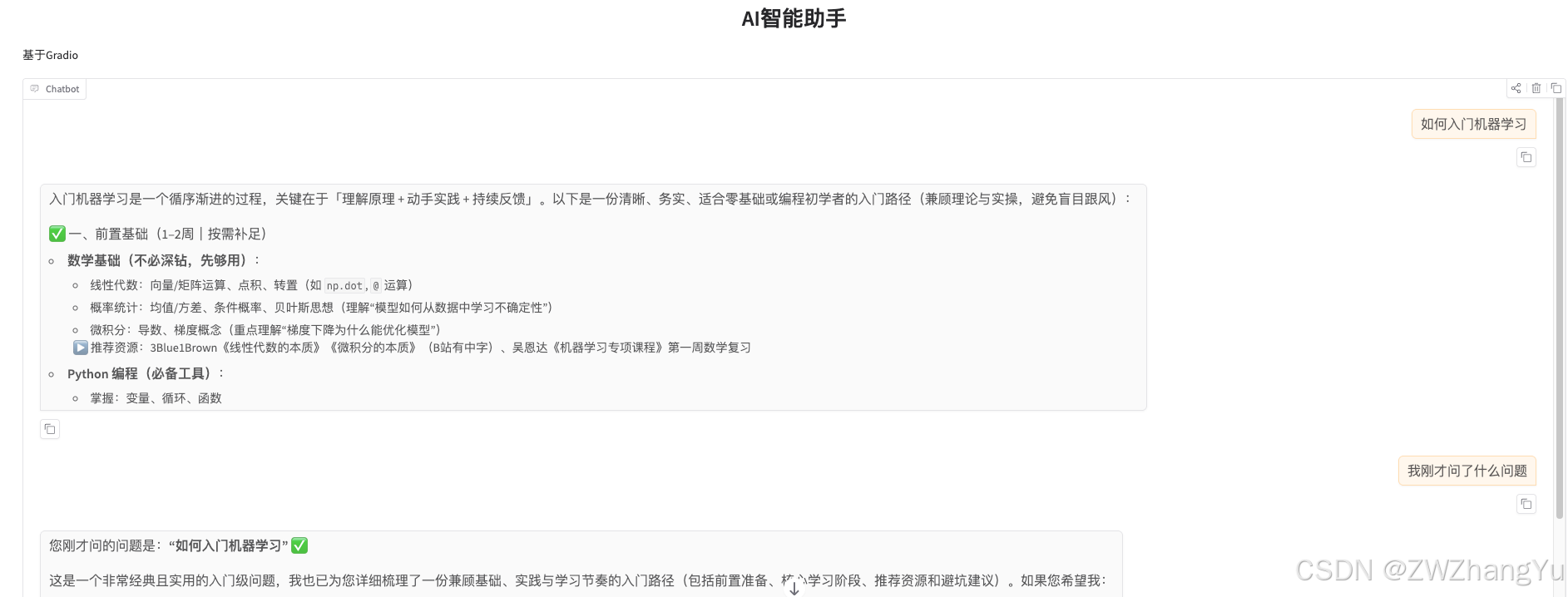gr.ChatInterface 本质上是一个高级封装组件,它帮你自动完成了:聊天界面(前端 UI)。自动生成:对话气泡(用户 / AI),输入框,发送按钮,滚动聊天记录,不需要写 HTML / CSS / JS。