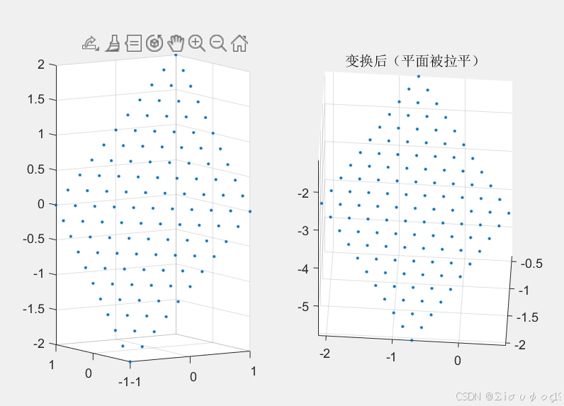 title('变换后(平面被拉平)');