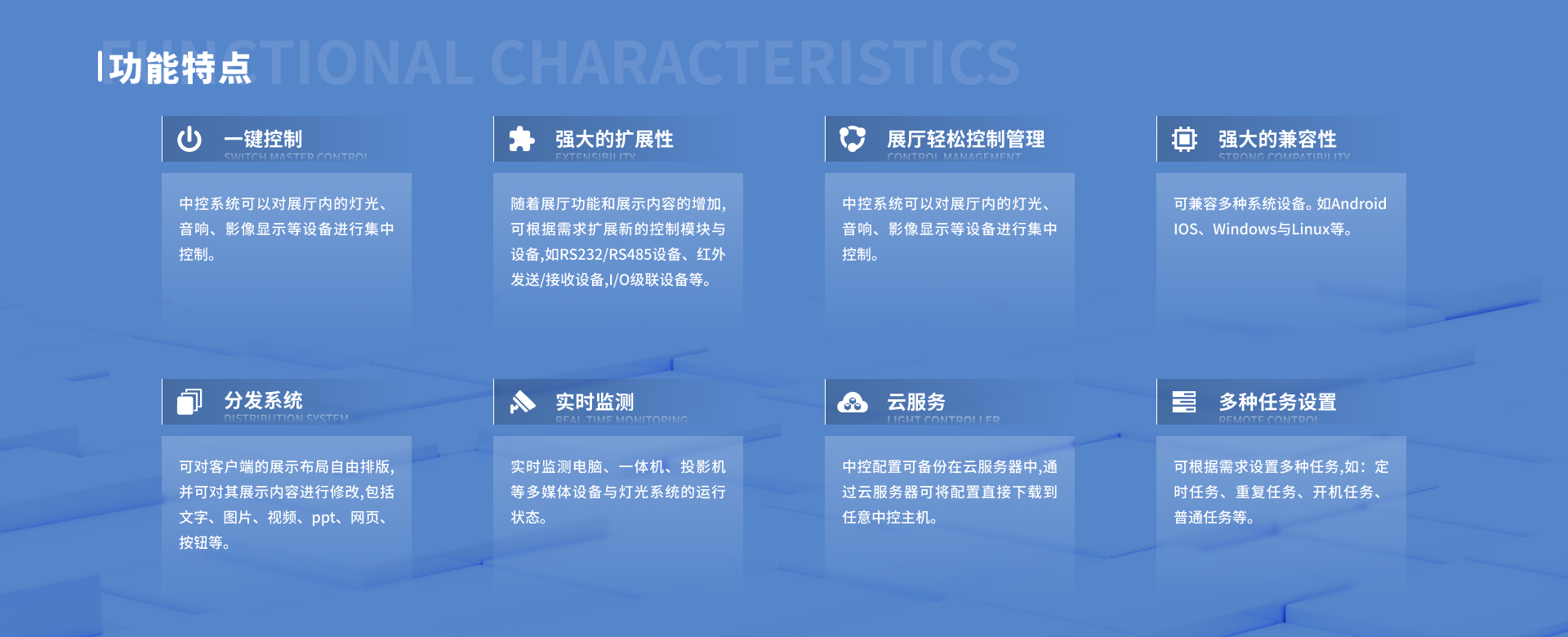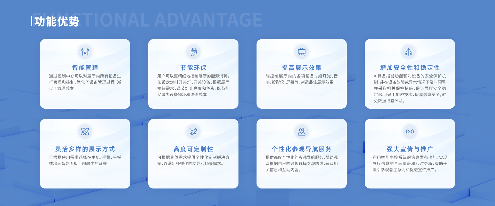 展厅作为展示交流的重要载体,可编程网络中央控制系统可实现展示效果的智能化升级与高效管理。系统可整合LED屏、展柜控制系统、互动设备等,通过场景化编程预设"开馆""参观""应急"等模式,启动参观模式时,可自动开启展品射灯、调节环境温湿度,观众靠近展柜时自动触发讲解音频,兼顾展示效果与文物保护。同时,系统支持远程运维与定时任务设置,可自动切换展示内容、关闭闲置设备,大幅减少人工运维成本,尤其适配政务展馆、博物馆等对安全合规要求较高的场景。