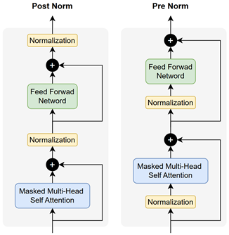 采用Pre-LayerNorm,缓解大模型训练中梯度不稳定问题。