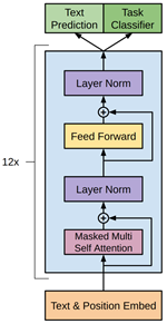 Text Prediction用于在预训练阶段输出下一个词的概率分布;Task Classifier用于在微调阶段适配下游任务。
