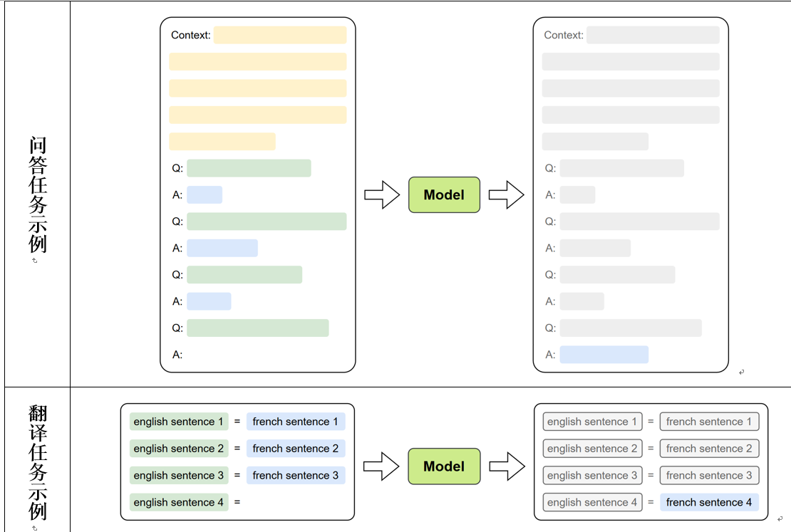 GPT-3 的核心创新在于首次系统提出并验证了"上下文学习(In-Context Learning)" 的概念:模型在使用阶段无需额外训练,仅依靠输入文本中的任务描述及少量示例即可理解并完成任务,如下图所示。
