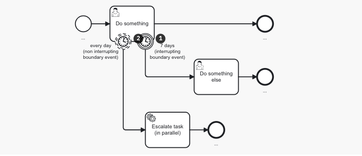 边界事件提供了一种方法来模拟在活动进行期间发生事件时应该如何处理。例如,如果某个流程正在等待用户任务完成,但等待时间过长,则可以将一个中间计时器捕获事件附加到该任务,并设置一个指向通知任务的出站序列流,从而允许建模者自动向用户发送提醒邮件。