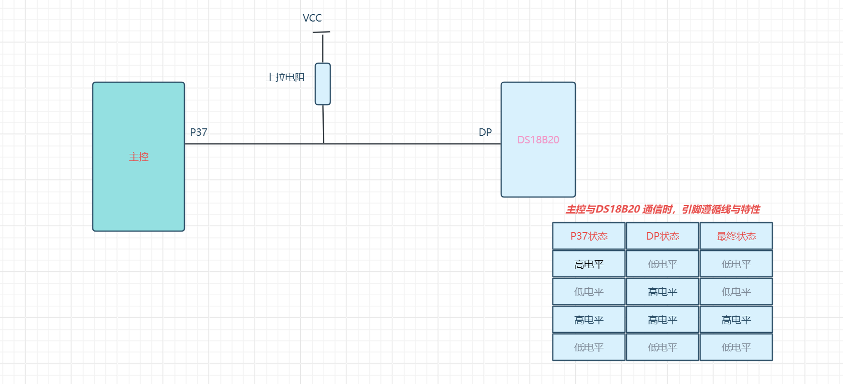 - 想要读取DS18B20 数据时,主控需要释放总线,检查引脚电平变化读取DS18B20 给主控的输入