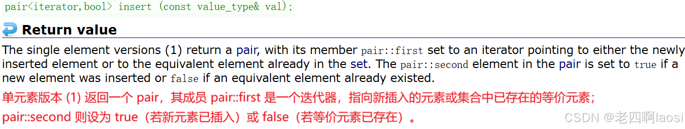 ① 因为不允许冗余,所以set有去重 的功能。插入操作会检查每个插入的元素是否与容器中已有的某个元素等价,如果等价,则该元素不会被插入,而是返回一个指向此已存在元素的迭代器。