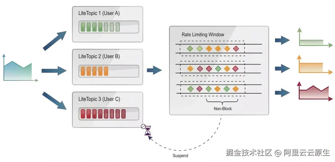 - 精准流控:每个 LiteTopic 可独立执行限流策略,支持按用户配置差异化阈值,真正实现"千人千面"的个性化流量治理。