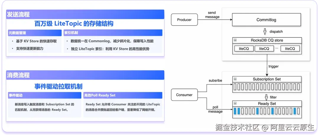 其底层基于创新的存储架构和分发机制,支撑了百万级 LiteTopic 的高效管理,在不牺牲性能的前提下,实现了海量 LiteTopic 资源的物理隔离,为 AI 场景下的精细化流量治理提供了坚实的技术基础。