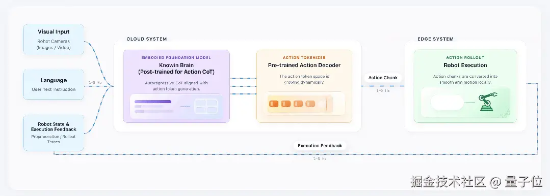 输入端整合机器人摄像头视觉数据、用户文本指令与本体状态反馈,以 1-5Hz 的频率同步输入云端 KnowinBrain 具身基座。