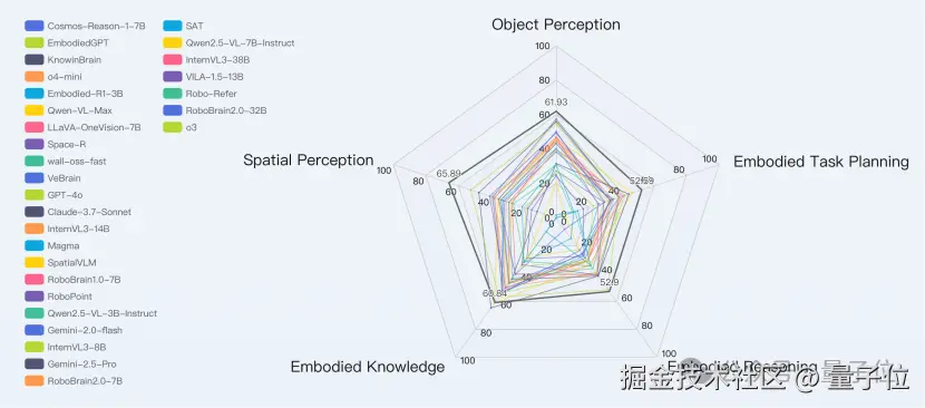 具身操作最相关的单项任务方面,KnowinBrain 在 Spatial Perception_(空间感知)、Object Perception (物体感知)、Embodied Reasoning (具身推理)、Embodied Task Planning(具身任务规划)_这四项能力上都排在第一。