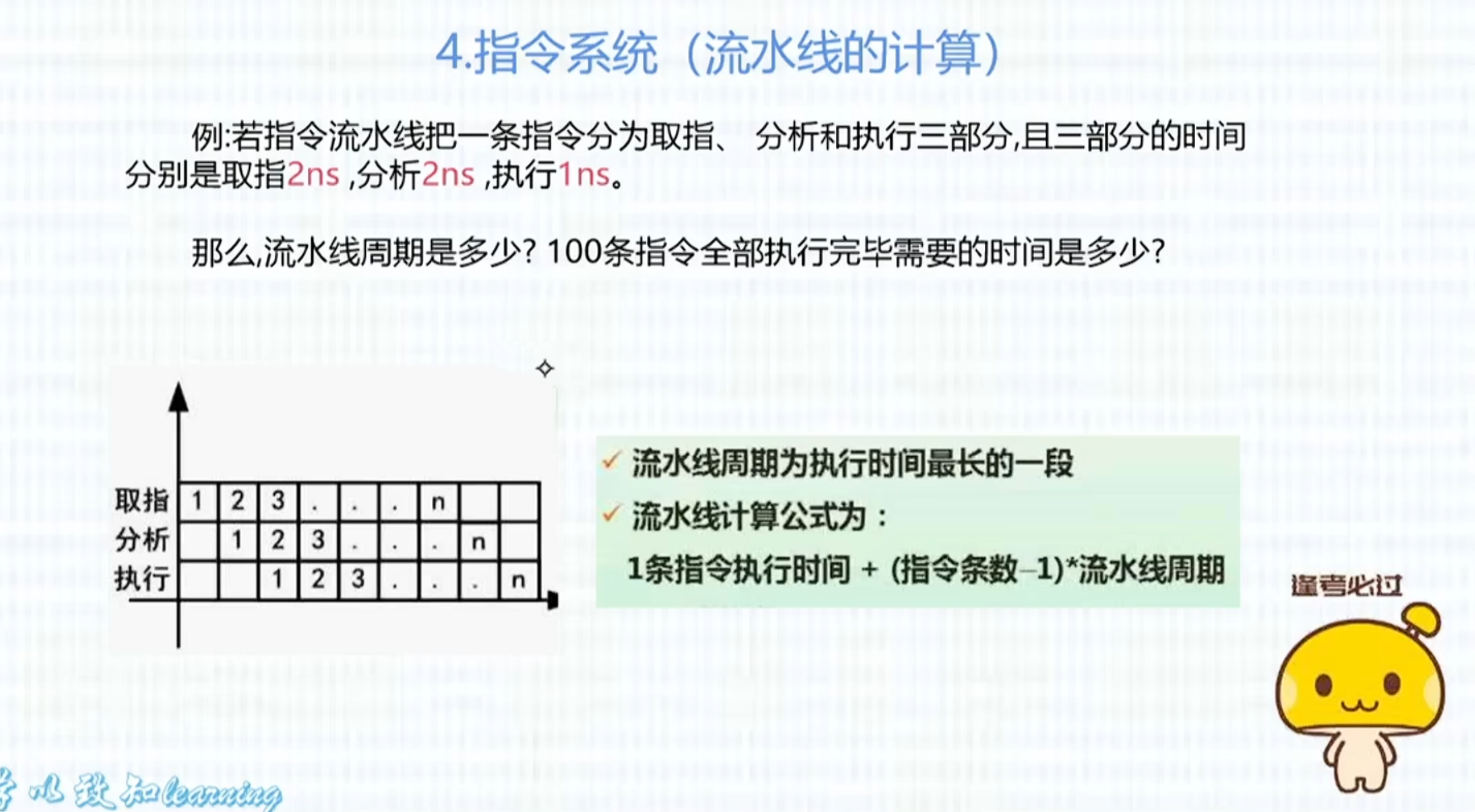 流水线执行时间: T总=T第一个指令的总时间+(n−1)×T=2+2+1+(100-1)X2=203ns