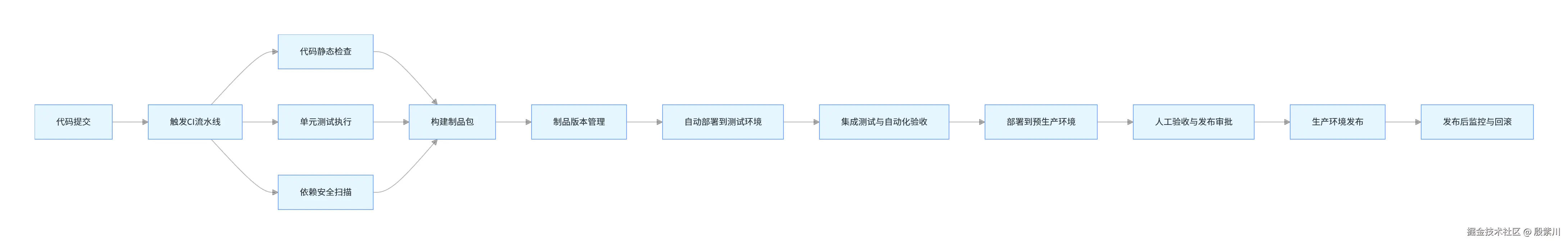 - 制品不可变性:整个交付流程只构建一次制品,所有环境都使用同一个制品,环境差异化配置通过环境变量、配置中心注入,绝对不能针对不同环境重新构建制品。
