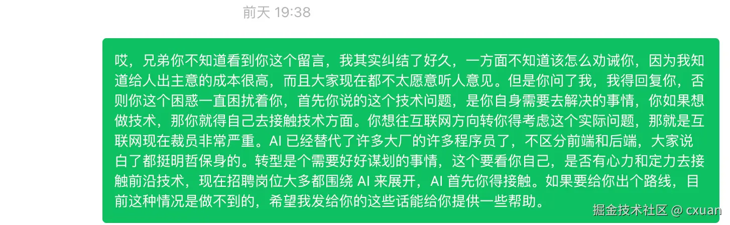 - 不要盯着"纯开发"岗位:如果他转到互联网行业,顶多只能算转行的新手、初级码农。初级码农的生存现状放在几年前都无比困难,更何况现在是 AI 时代------一个行动力强的资深程序员,加上几个 agent,效率已经能吊打不少中小公司。转行的收益太低,成本太高。