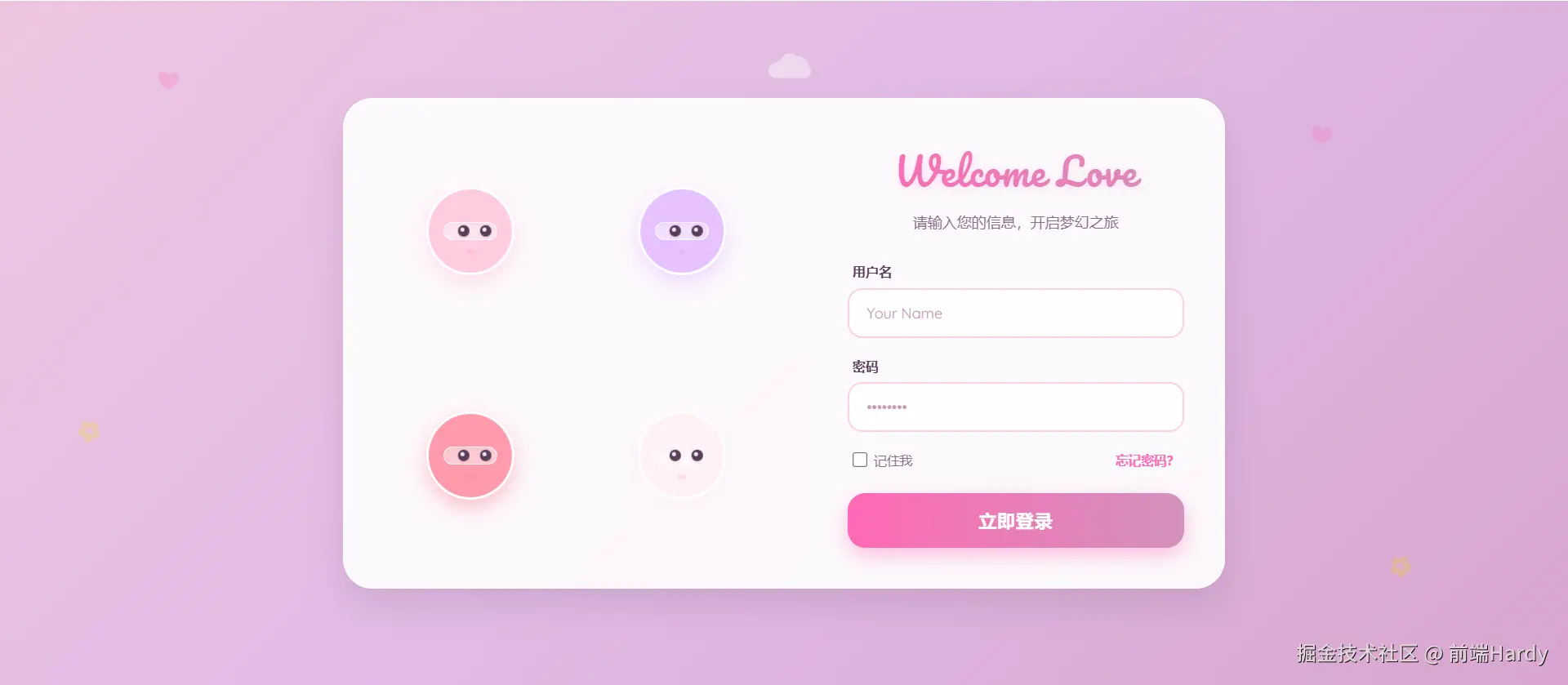 - 微交互反馈:聚焦用户名时,左边两位"凑近偷看";聚焦密码时,右边两位"紧张张望"