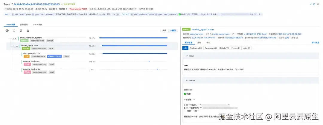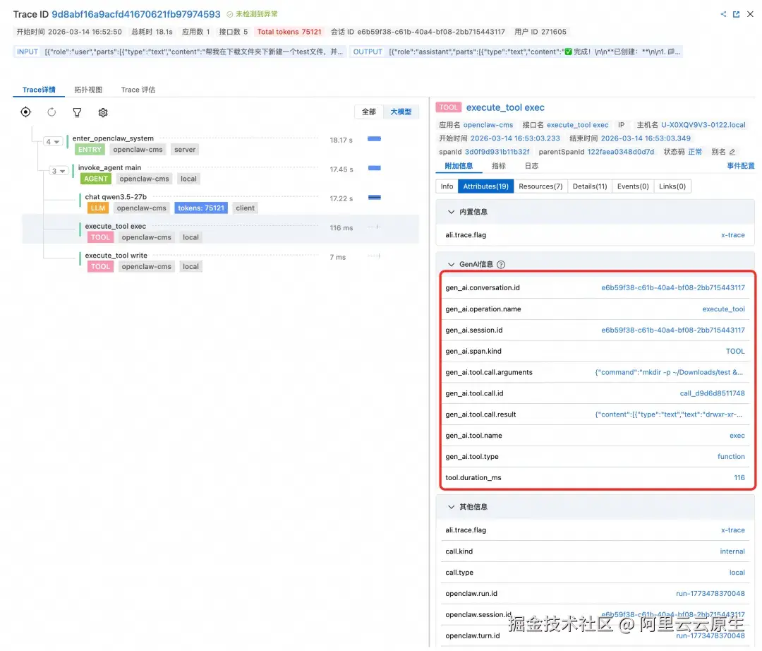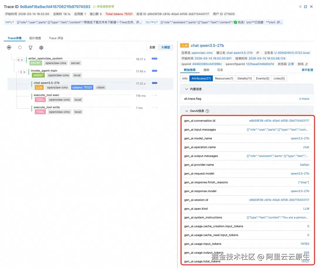 值得一提的是,openclaw-cms-plugin 上报的 Trace 数据严格遵循 OpenTelemetry GenAI 语义规范。这不是我们自己拍脑袋定义的字段名,而是国际标准。