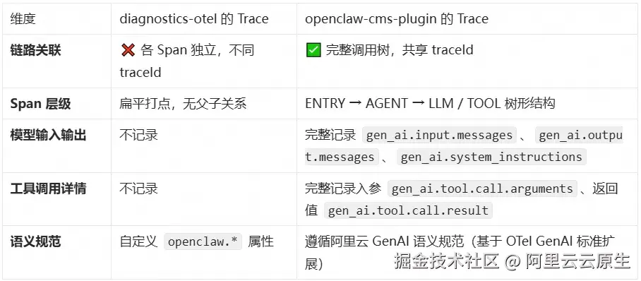 等等,diagnostics-otel 不是也能上报 Trace 吗?为什么还需要 openclaw-cms-plugin?
