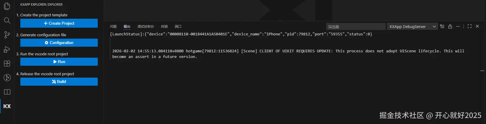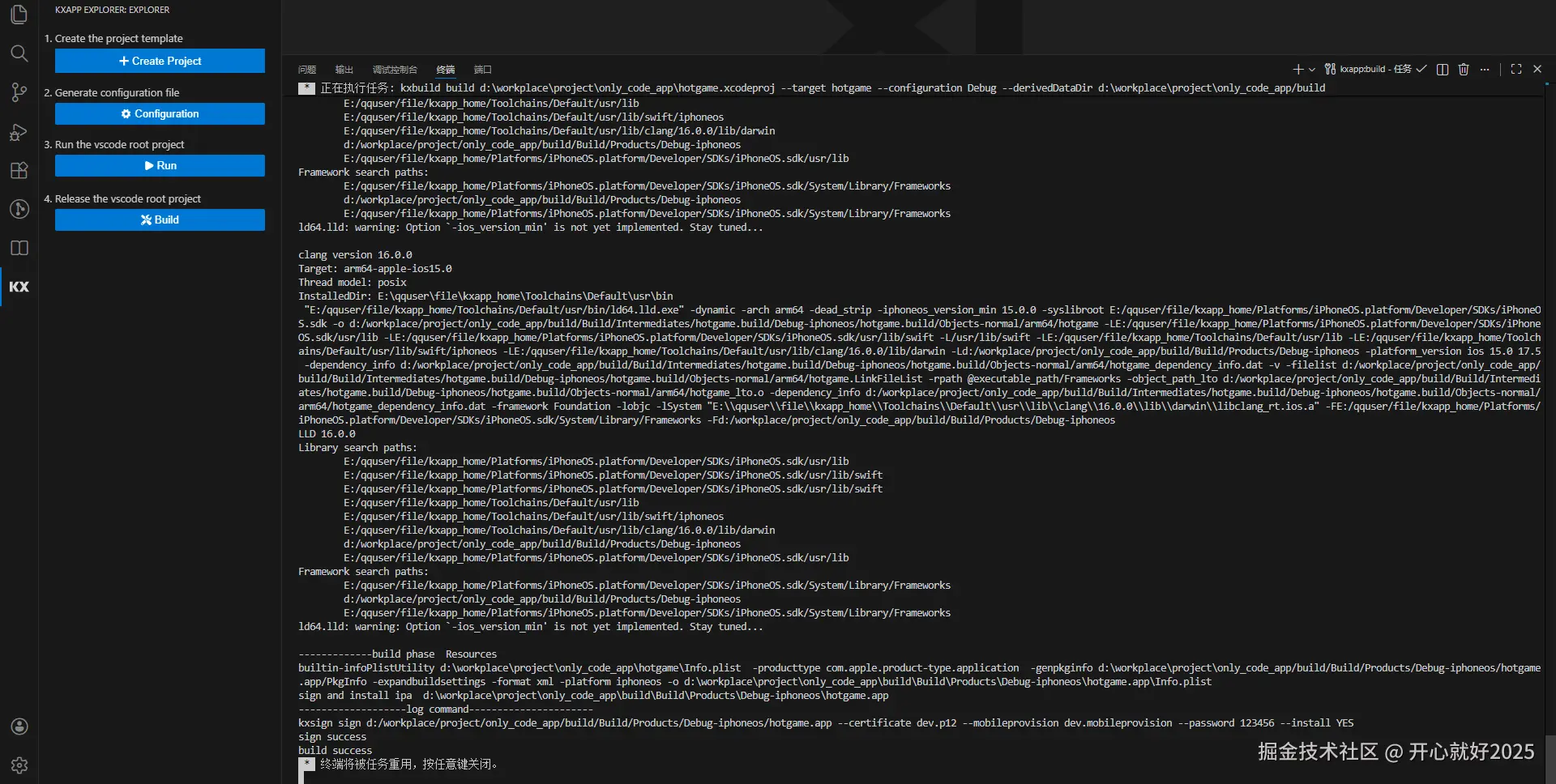 构建日志会显示在输出面板中,如果出现编译问题,可以查看详细信息。