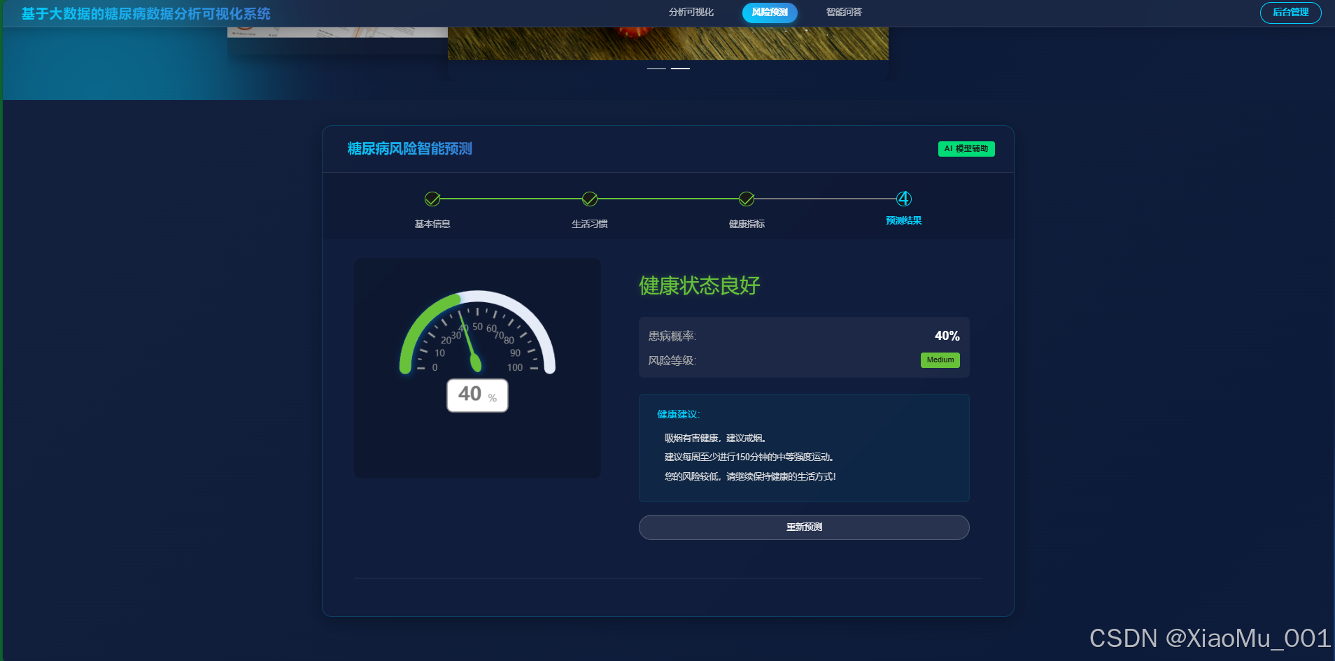 基于训练好的随机森林模型,用户输入健康指标(如 BMI、血压、年龄等),系统实时计算患糖尿病的风险概率。