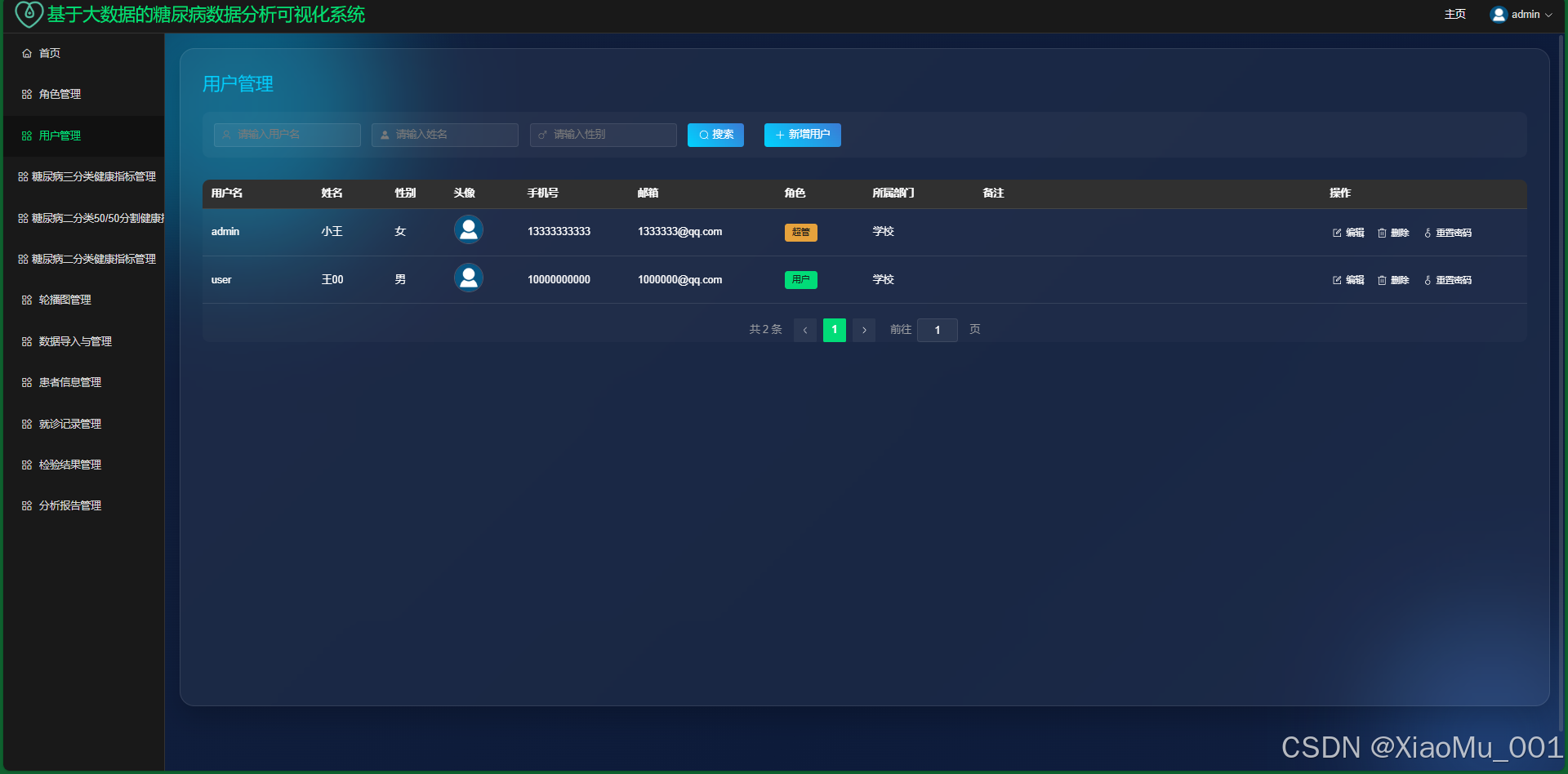 管理员可以对糖尿病数据集进行增删改查操作,支持批量导入导出。