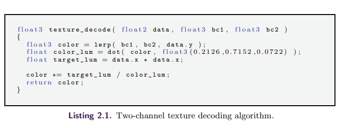 一般纹理上一个像素的颜色信息是存在RGB三个通道里,本篇文章将纹理通过一些前置条件把三个通道的信息有损压缩到两个通道上。