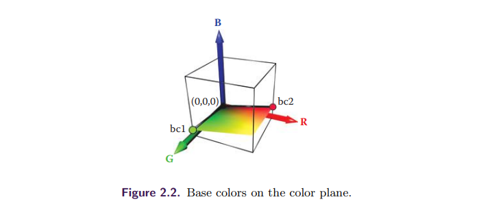 这个颜色平面在RGB颜色空间中与边界交叉可以获得几个顶点,一个顶点是(0,0,0),与顶点相邻的两个顶点(bc1,bc2)则定义为该颜色平面的基色。也就是平面的两个基向量。