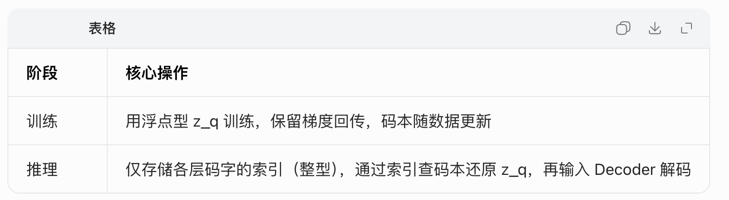 承诺损失中的||sg[r_l] - c_l*||²项 → 仅更新第 l 层码本(r_l 的梯度被截断,避免 Encoder 干扰码本); - 优化器:Encoder/Decoder 用 AdamW,码本可单独用小学习率(如 1e-5)更新,防止码本震荡。