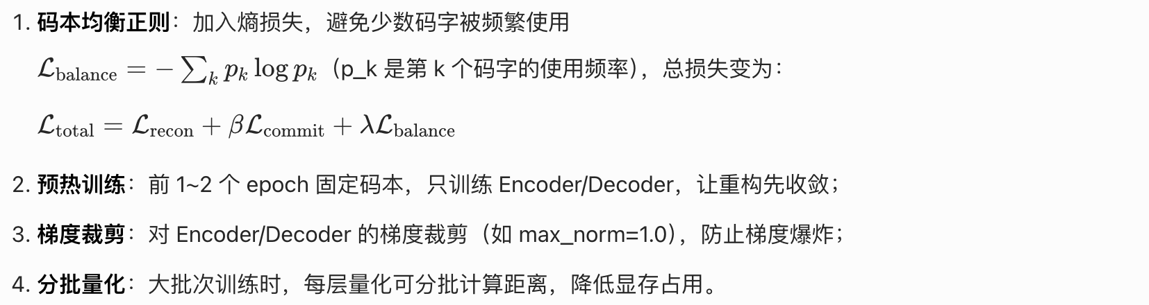 - 训练关键是防码本崩溃(加均衡正则、预热训练),保证每层残差逐步收敛到 0;