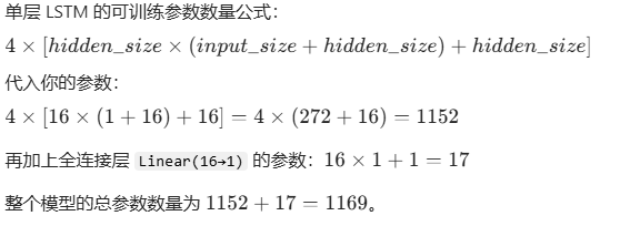 代码中 LSTM 的具体结构结合代码中的参数 :input_size=1、hidden_size=16、num_layers=1,这个 LSTM 的结构可以拆解为 "单层、单方向、隐藏维度 16 的 LSTM",具体如下: