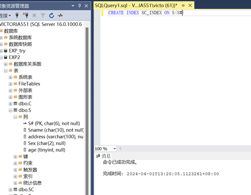 本次实验的核心内容分为两大部分:索引的创建与撤销、数据更新操作。在索引操作部分,我按照实验要求,参照教材例题完成了S表索引的创建与撤销。创建索引时,使用CREATE INDEX语句为S表的S#字段建立索引,看似简单的一行代码,实则需要准确把握表名、字段名的拼写,稍有疏忽就会出现语法错误。而撤销索引时,DROP INDEX语句的使用同样需要注意索引名与表名的对应关系,确保索引能够被正确删除。通过这部分操作,我明白了索引在数据库中的作用------合理的索引能够提高数据查询效率,尤其是在数据量较大的表中,索引的优势会更加明显,同时也理解了索引并非越多越好,不当的索引反而会增加数据更新的负担。