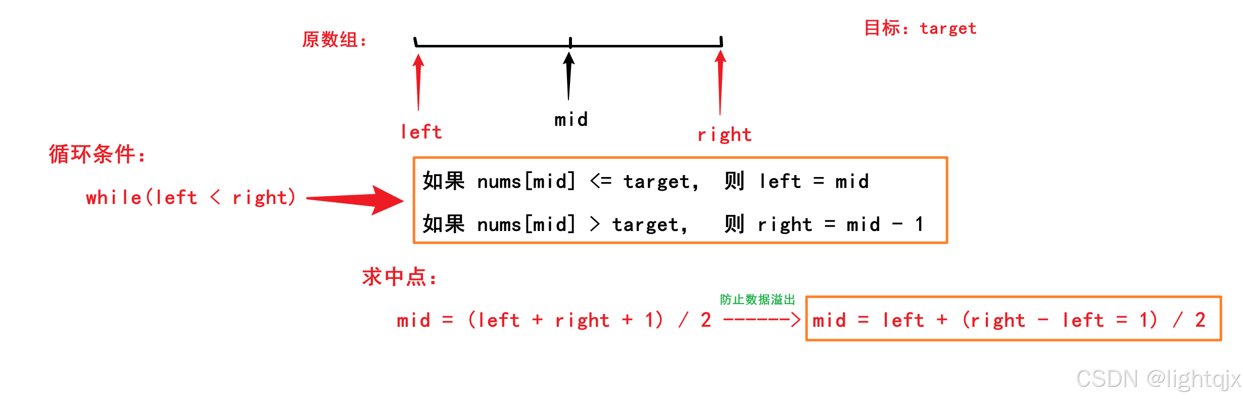 如此重复操作,left 和 right 就会逐渐靠近,最终遇到 left == right ,而当 left == right 时,我们仍然需要计算 mid,此时的 mid 下标的元素就是left 和right中对应的元素,那么当left和right相遇时的元素如果等于 target,返回 mid 即可;但是如果不等于target,则说明这个数组中没有与target相同的元素,因为此时我们已经通过left和right 扫描完了整个数组。因此,我们循环的判断条件就是while( left <= right ) ,。 - 如何计算 mid 的值?