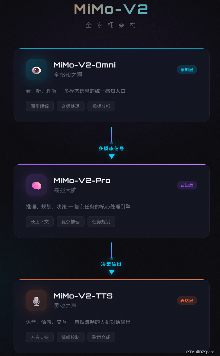 小米MiMo-V2系列并非孤立的产品,而是一个精心设计的"全家桶"解决方案。它们各自分工明确,又协同工作,共同构成了一个智能体从感知世界、思考决策到表达输出的完整闭环。