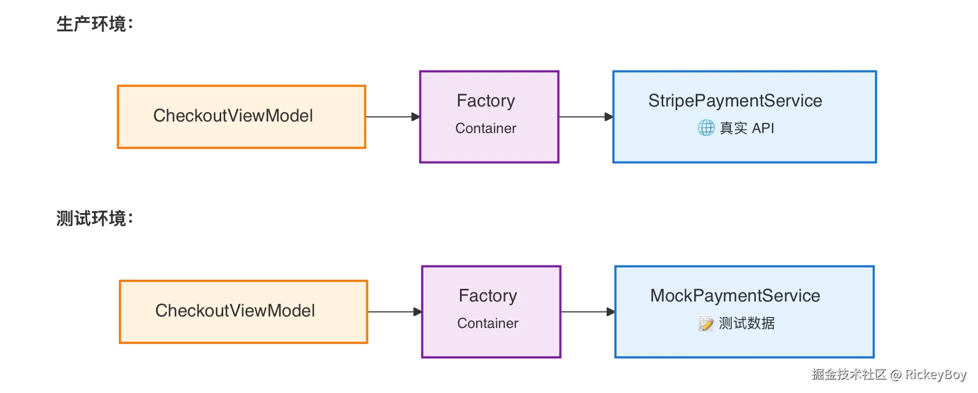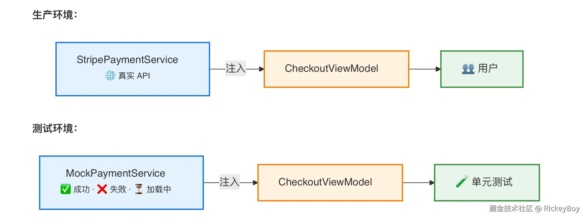 这个 ViewModel 直接持有了它的依赖。想在测试中把 PaymentService 换成 mock?根本换不了。
