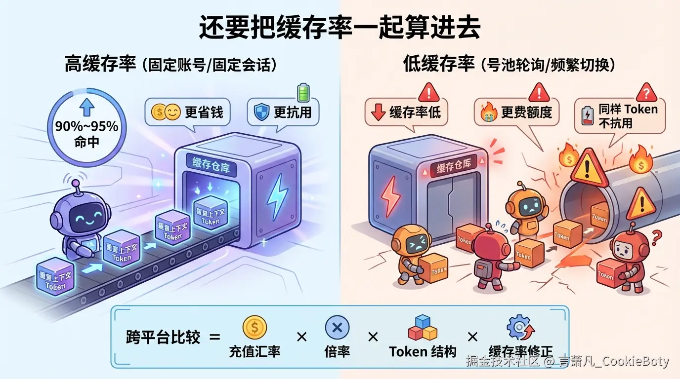 比较价格,不能只看"¥多少 = $1" 或倍率数字,还要看这个平台能不能把你的高重复上下文真正缓存住。