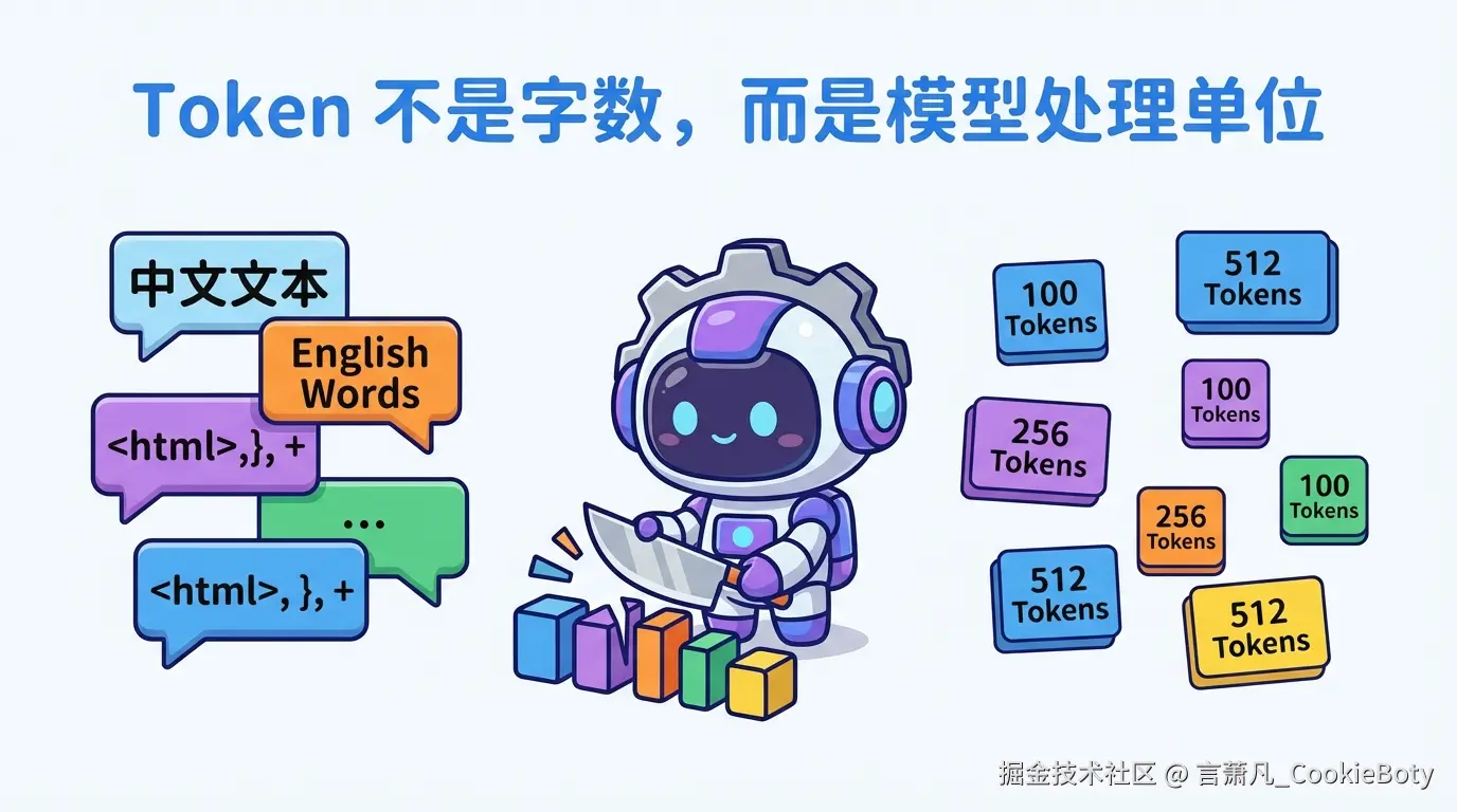 这也是为什么很多人实际使用时会发现:看起来字数不多,但账单并不低。因为模型看到的不是"字数",而是经过切分后的 Token 序列。