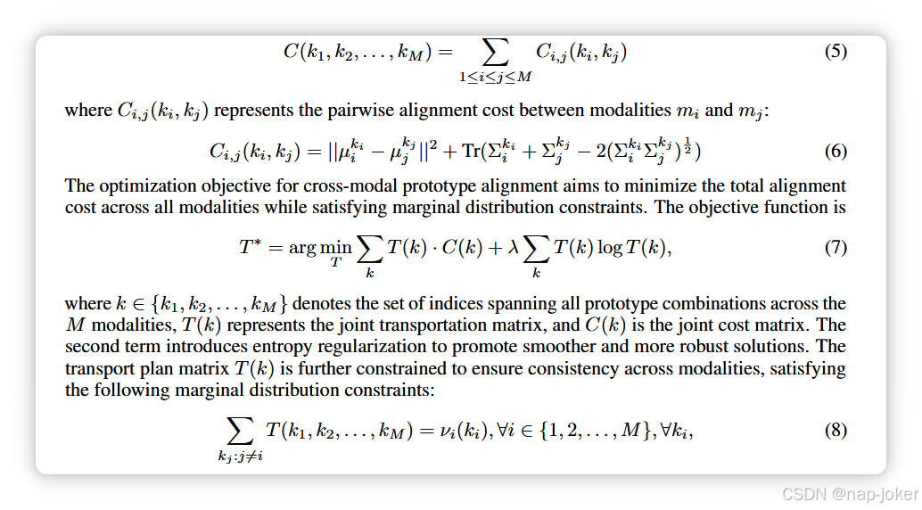 **原型指导的最优运输。**不同模态的模态独特特征通常存在于具有显著分布差异的特征空间中,传统的点对点比对方法难以同时捕捉全局和局部关系。为应对多模态场景中的这一挑战,我们引入了多边际最优传输方法,以建不同分布之间的匹配。跨模态原型匹配成本矩阵定义为:
