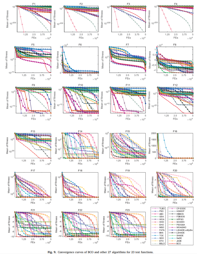 原文作者在23个标准基准函数上测试BCO。接下来,我们使用CEC2017测试套件评估其性能,其中包含10维、30维、50维和100维问题。然后,我们通过结合来自CEC2014、CEC2020和CEC2022套件的测试集进一步验证BCO的有效性。最后,我们通过将BCO成功应用于15个具有约束条件的实际工程问题,证实了它的实用性。将BCO应用于三维无人机的路径规划中,该路径规划涵盖了两种类型的航路点,每种航路点对应8种不同的地形场景,并考虑了有效规避多种威胁的要求。与原来27个算法中选出的7个优秀算法相比,BCO在Friedman测试中名列前茅,突出了其优势和竞争力。这些发现表明,BCO是解决复杂现实挑战的强大新工具,具有推进未来优化的巨大潜力。