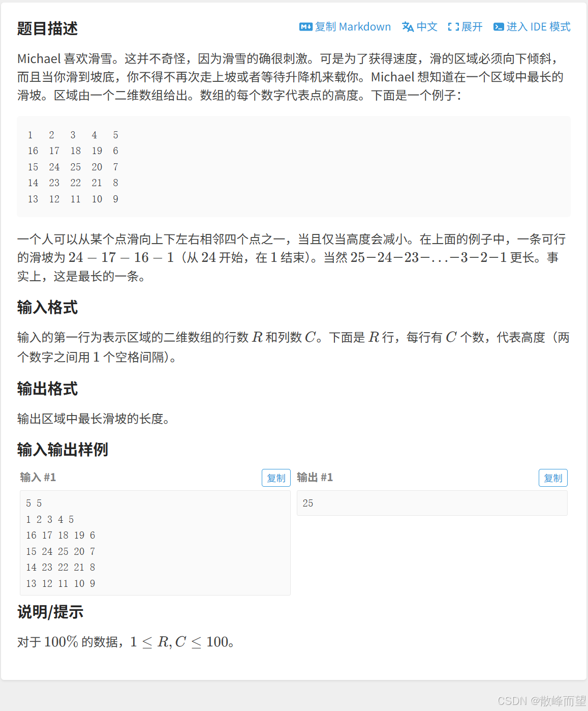 遍历整个矩阵,计算以每一个位置 [i, j] 作为起点时,能够滑行的最远距离。最终,在所有计算结果中取最大值,即为问题的答案。