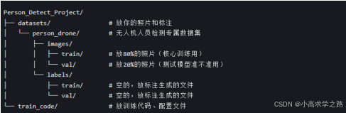 在电脑里新建一个根文件夹,比如叫 D:\Person_Detect_Project\,然后按下面的结构建好子文件夹(复制文件夹名就行,别乱改):