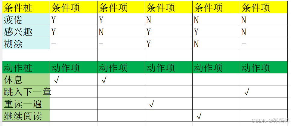如果感到疲倦 则休息,如果不疲倦且不感兴趣 则跳入下一章,如果不疲倦且感兴趣且感到糊涂 则重读一遍,如果不疲倦且感兴趣且不感到糊涂则继续阅读,用判定表描述法处理逻辑。