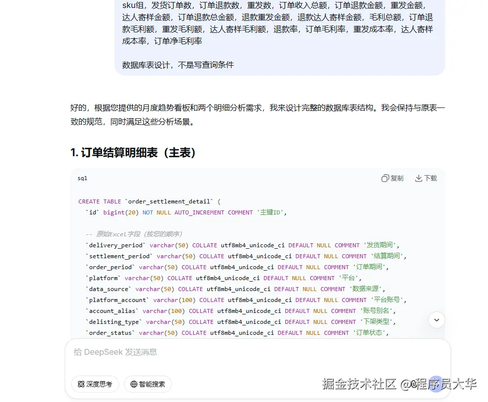 以前设计字段需要一个个自己思考、翻译。现在有了AI,我把中文需求描述清楚后,直接让DeepSeek生成建表SQL语句,就像这样: